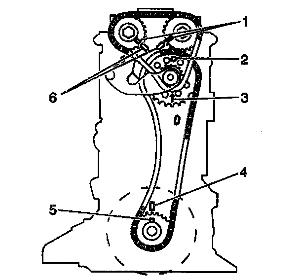 - The guide pins (1) on the camshaft sprockets line up with the notches (6) on the cylinder head.