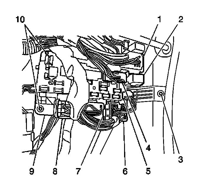 6. Install the bracket that contains the fuel pump relay and the main relay to the left front side of the junction block (9).