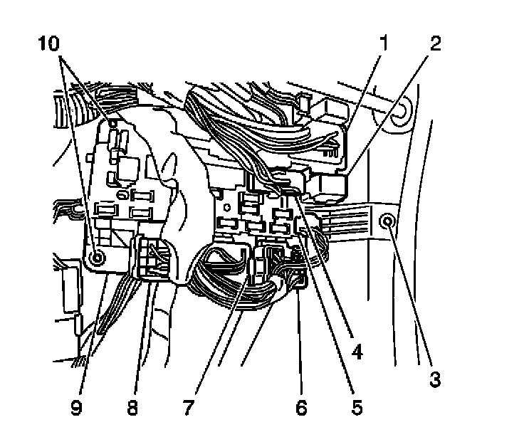 6. Remove the 2 nuts (10) that retain the junction block (9) to the left hinge pillar.