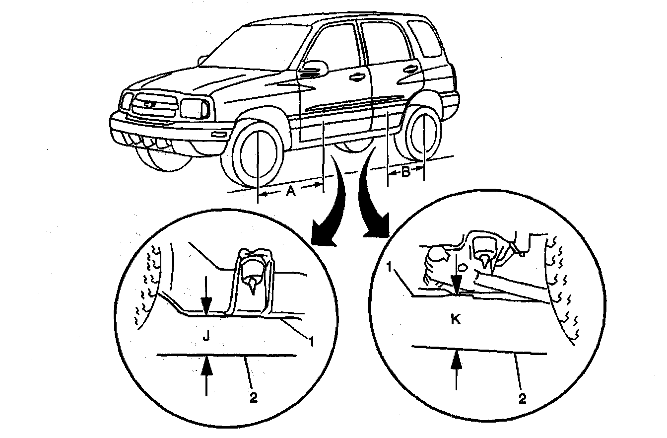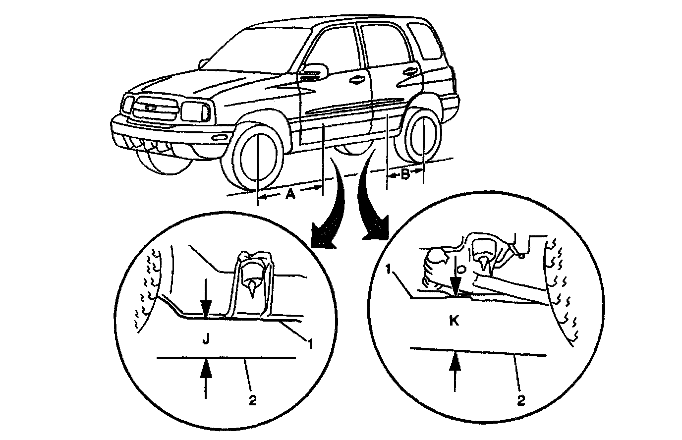 3. Measure the K dimension from the left and the right frame rail (1) to the ground (2) 700 mm (27.56 inch) from the rear wheel centerline (B dimension).