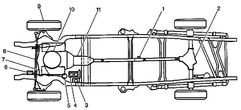 Refer to the illustration for the location of the lubrication points for the chassis. Lubricate transmission shift linkage. Lubricate the park brake guides, underbody contact points and linkage.