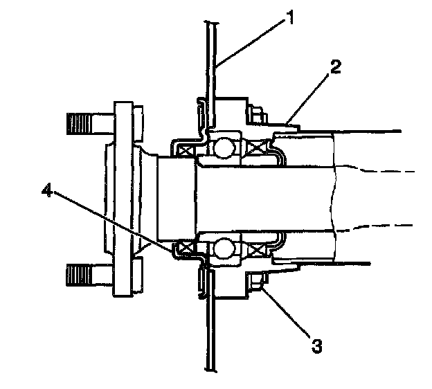 1. Align the serrations on the wheel stud (1) with the serrations in the rear axle flange hole.