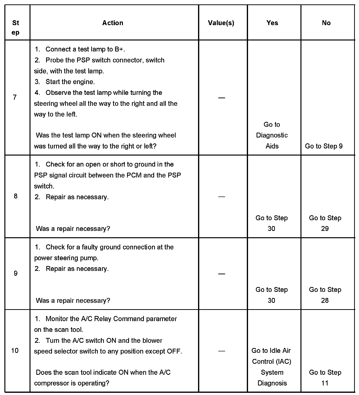 7. This step checks for an inadequate ground connection at the power steering pump or a faulty PSP switch.