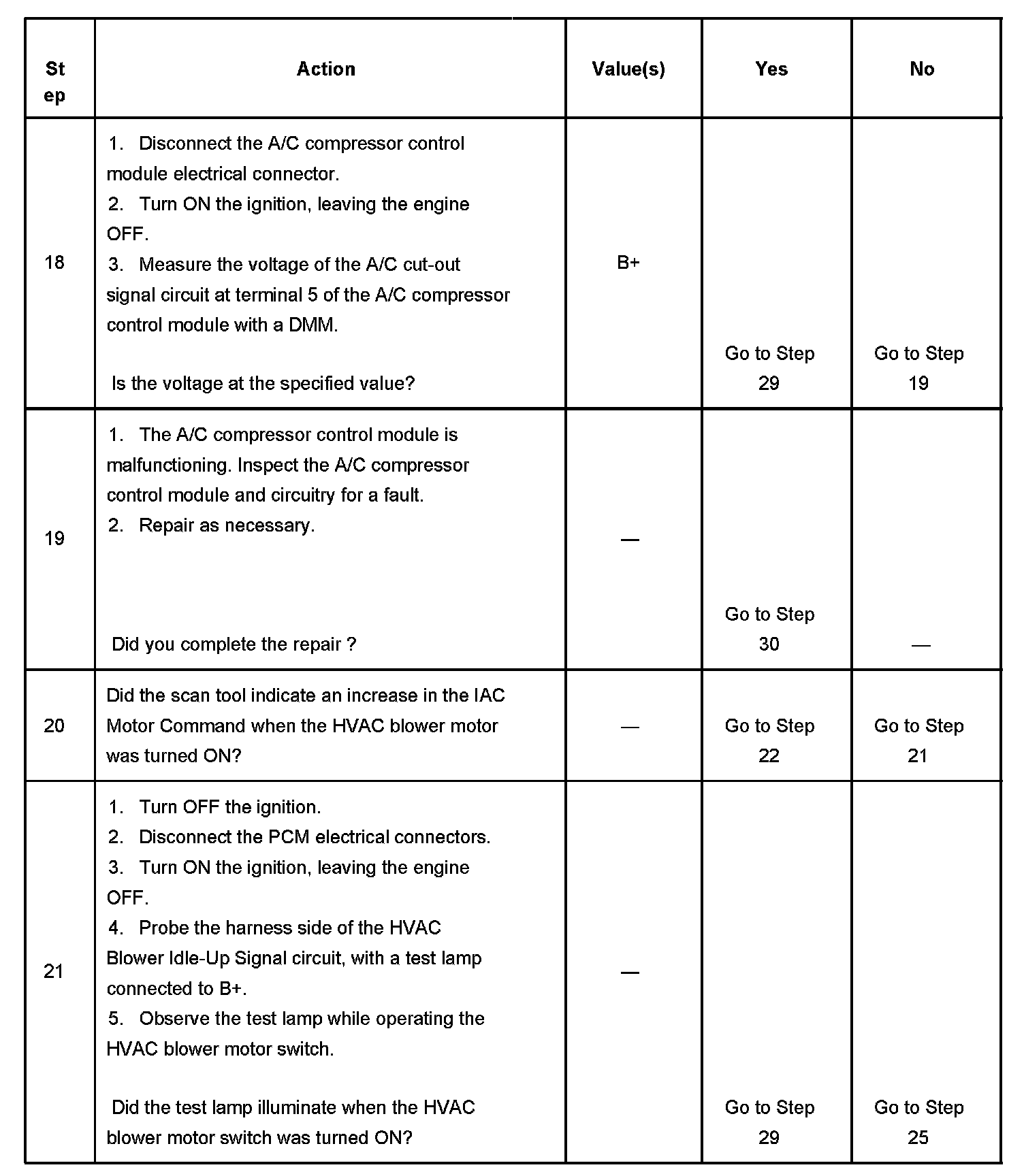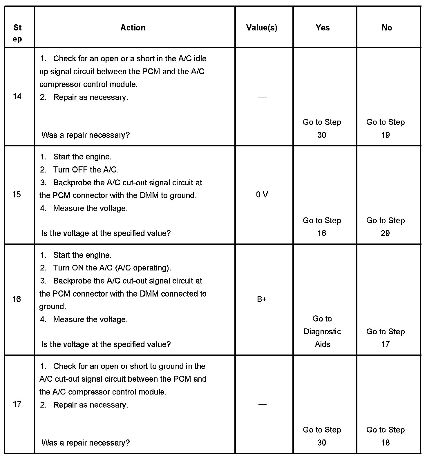 16. The A/C cut-out signal circuit at the PCM should indicate B+ with the A/C ON (operating).