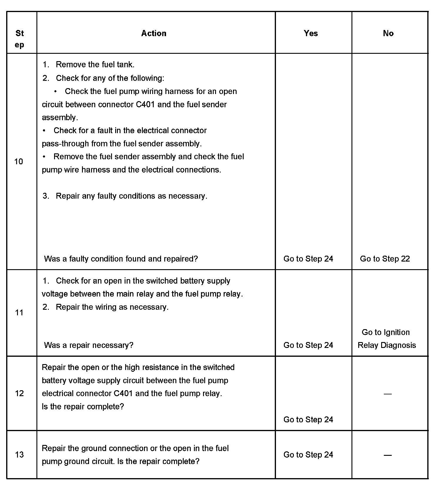 10. This step checks for an electrical fault in the fuel tank or in the fuel pump wire harness.