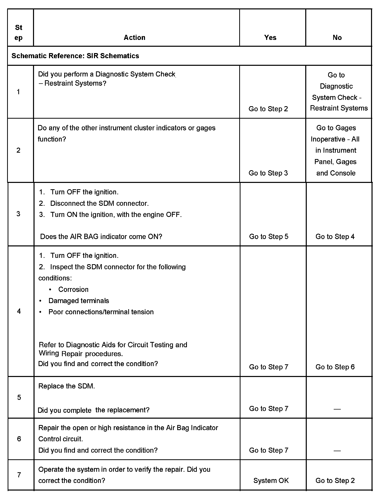 CIRCUIT DESCRIPTIONThe ignition switch supplies ignition 1 voltage to the inflatable restraint sensing and diagnostic module (SDM) using the AIR BAG fuse. The ignition switch also supplies battery voltage to the AIR BAG indicator using the IG fuse. The AIR BAG indicator is connected to the AIR BAG indicator output of the SDM. When the ignition switch is first turned to the ON position, the SDM responds by flashing the AIR BAG indicator seven times. If the ignition 1 voltage is outside of the normal operating voltage range (9.0 - 16.0 volts) for more than 25 ms, the AIR BAG indicator will turn ON with no DTCs set.