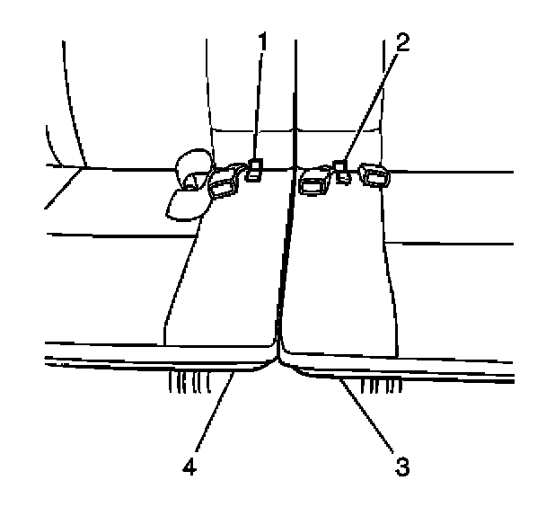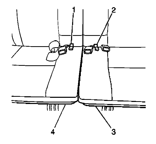 1. Pull the rear seat pull straps (1 and 2) and raise the rear seat cushions (3 and 4) in order to gain access to the rear seat center belt and buckle bolts.