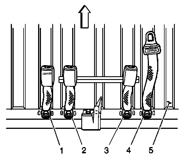 1. Install the rear seat center buckle (1) to the floor pan (5). Secure the buckle with the anchor bolt.
