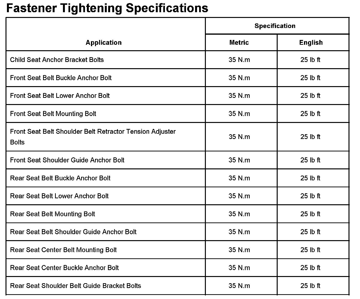 Fastener Tightening Specifications: