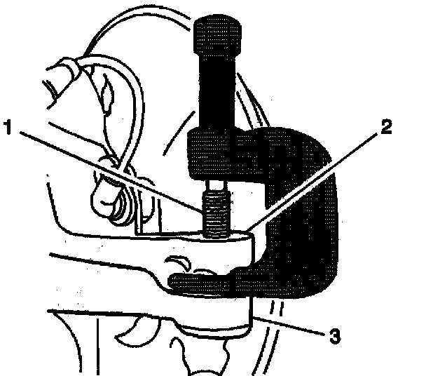 4. Disconnect the outer tie rod end (3) from the knuckle (2) using the J6627-A.