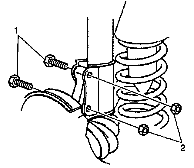 8. Remove the 2 strut bracket nuts (2) and the 2 strut bracket bolts (1). Hold the strut by hand so that the strut will not fall.