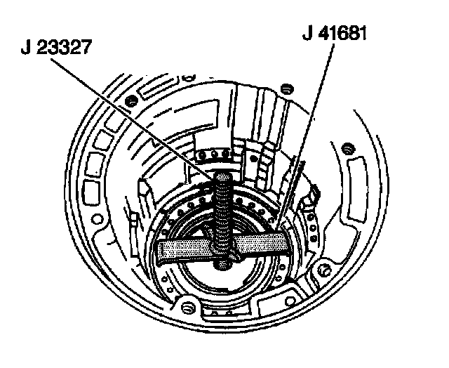 4. Compress the reverse brake piston using the J 41681 and the J 23327 in order to install the snap ring.