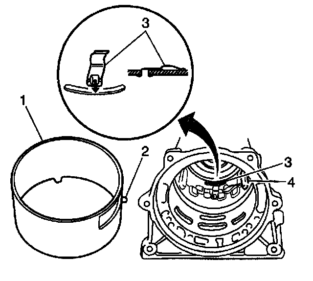 3. Install the brake applying tube (1) and leaf spring (3) to the transmission case. Align the tube lug (2) with the cutout in the case (4).