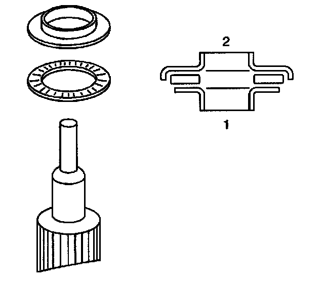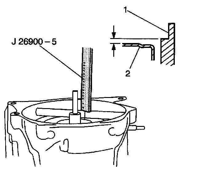 5. Measure the height difference between the forward clutch (2) input shaft and the transmission case (1) using the J 26900-5.