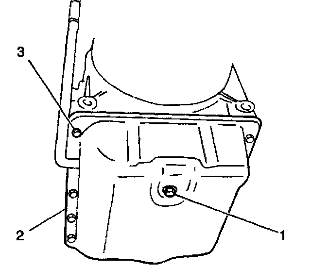 9. Remove the transmission fluid pan (2) the bolts (3) and the gasket from the transmission.
