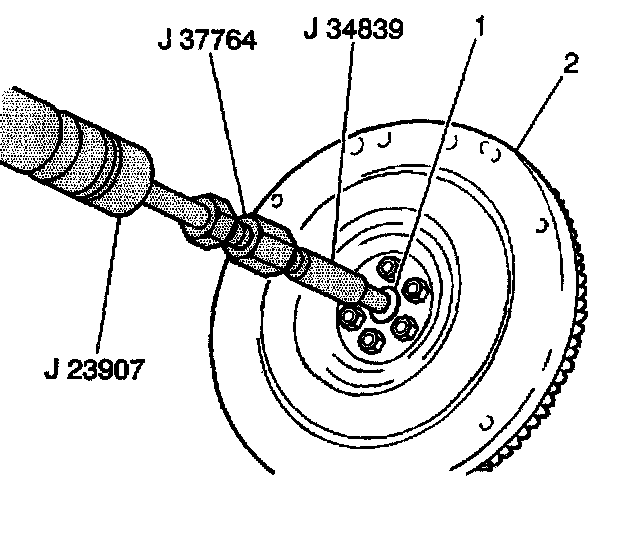 3. Remove the clutch pilot bearing (1) from the crankshaft using the J 37764, J 34839 and the J 123907.