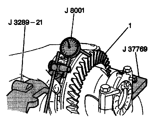 1. Install the J 8001 to the differential carrier with the dial indicator plunger against a ring gear tooth.