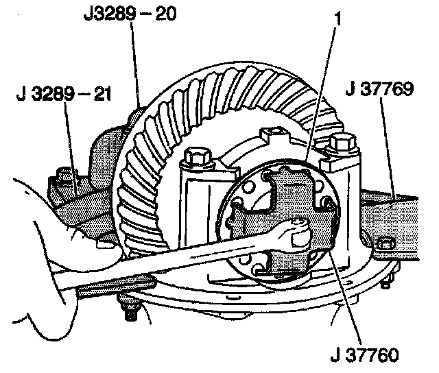 1. Use the J 37760 until it no longer makes contact with the right differential side bearing race in order to loosen the right differential side bearing adjuster (1).