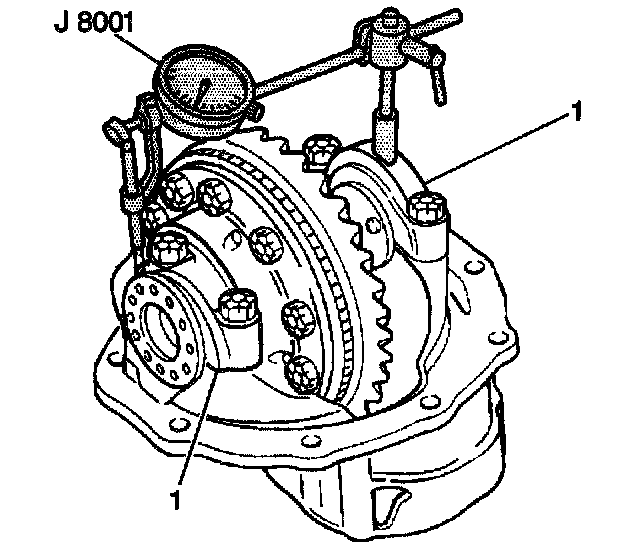 5. Install a J 8001 on the differential carrier between the center of each side bearing cap (1) to measure case spread.