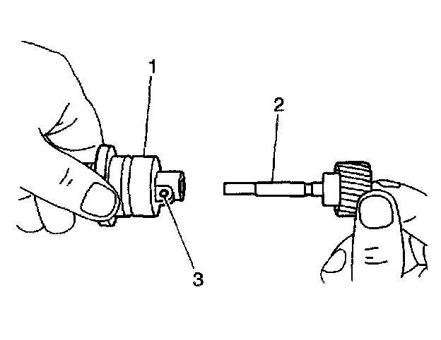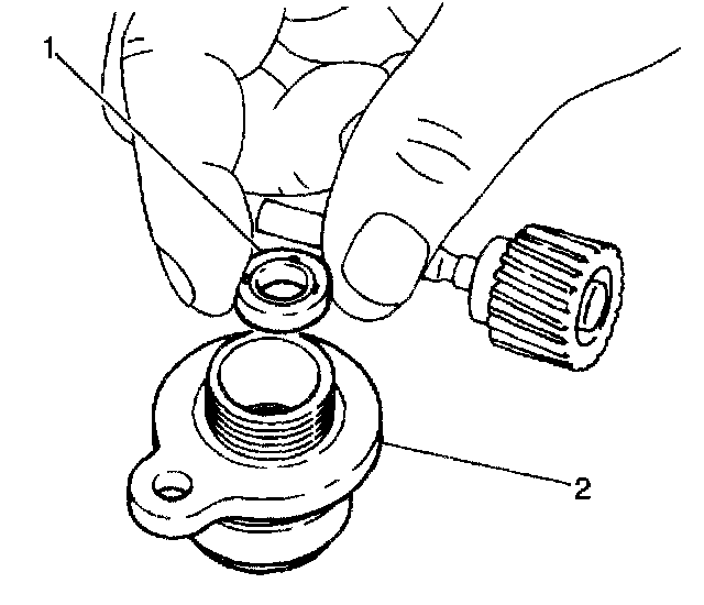 3. Install the speedometer driven gear (1) into the speedometer gear case (2). Secure the speedometer driven gear with one roll pin.