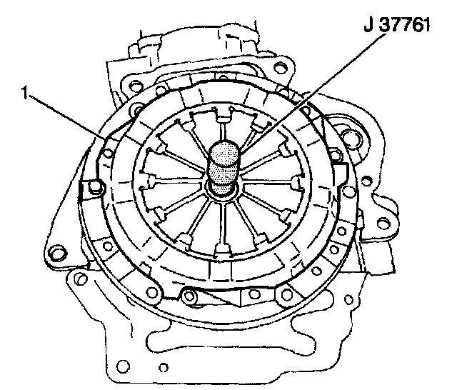 1. Inspect the clutch alignment by inserting the J 37761 through the clutch disc and into the crankshaft pilot bearing. If the J 37761 does not fit through the clutch disc and into the pilot bearing assembly smoothly, the clutch disc may be misaligned.
