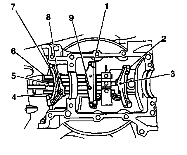 1. Install the reverse gearshift fork (4) to the reverse gearshift shaft (5). Use the reverse gearshift fork roll pin (3) in order to secure the reverse gearshift fork to the reverse gearshift shaft.