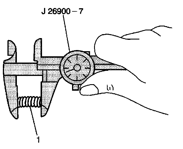 12. Use the J 26900-7 in order to measure the locating spring (1) length. The standard locating spring length is 24.0 to 27.0 mm (0.945 to 1.063 inch). If a spring is less than 24.0 mm (0.945 inch), replace the spring.