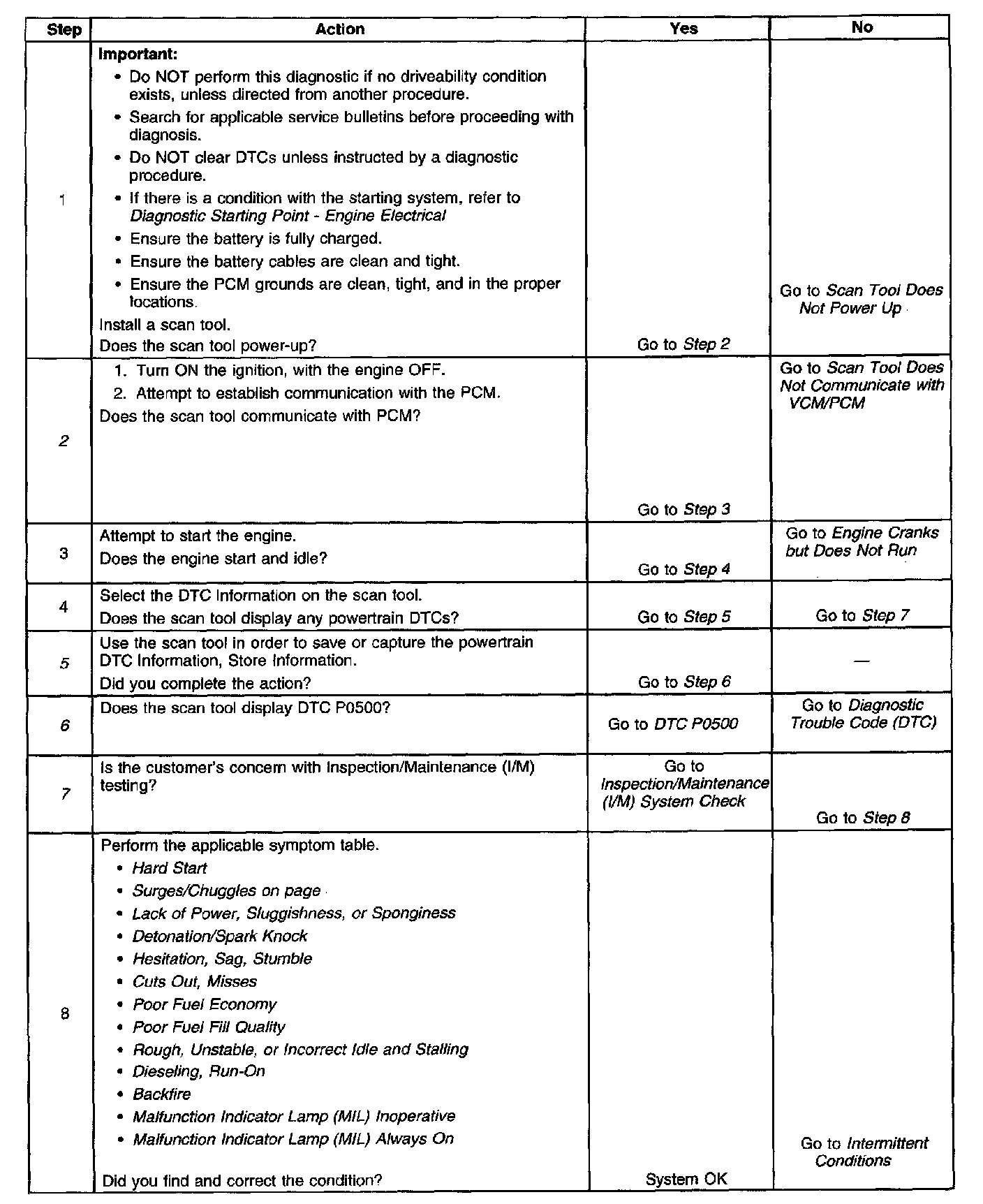 Diagnostic System Check- Manual Transmission DescriptionThe Diagnostic System Check-Engine Controls is an organized approach to identifying a condition that is created by a malfunction in the engine control system. The Diagnostic System Check must be the starting point for any driveability concern. The Diagnostic System Check directs the service technician to the next logical step in order to diagnose the concern. Understanding and correctly using the diagnostic table reduces diagnostic time and prevents the replacement of good parts.