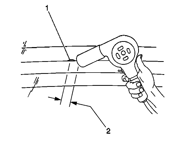 9. If using a J 25070 , hold the J 25070 25-50 mm (1/2 in) (2) away from the repair area for 2-3 minutes.
