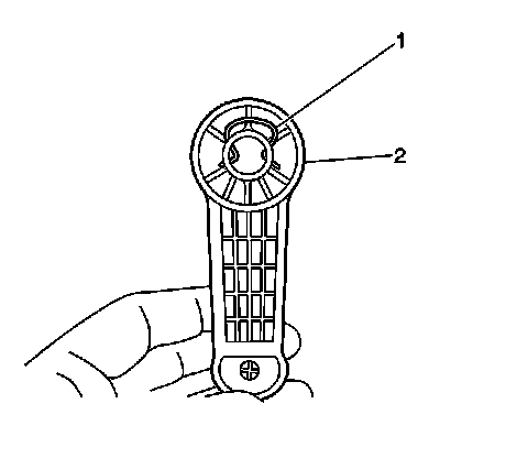 1. Install the window regulator handle snap ring (1) to the window regulator handle (2).