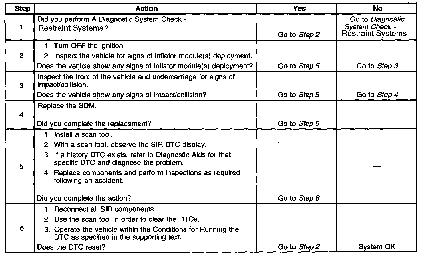 The inflatable restraint sensing and diagnostic module (SDM) contains sensing devices that convert vehicle velocity changes to electrical signals. The SDM processes the generated electrical signals and compares them to values stored in memory. When the generated signals exceed the stored values, the SDM performs additional signal processing and compares the generated signals to signals stored in memory. When two of the generated signals exceed the stored values, the SDM will cause current to flow through the inflator modules, deploying the inflator modules. DTC B0053 will set along with DTC B0051 when a deployment occurs while a circuit malfunction is present in any one of the deployment loops.