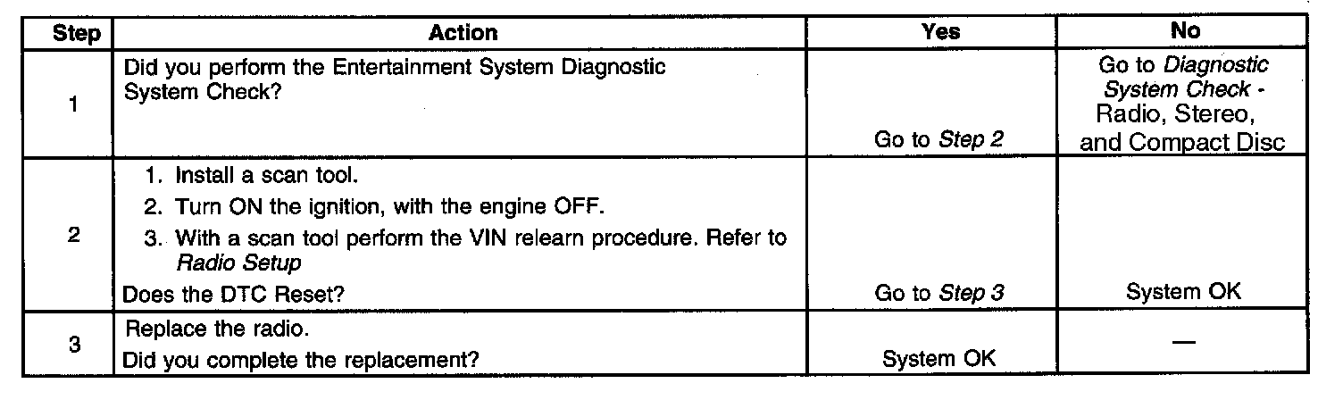 This DTC is generated by the module when the VIN as received over the class 2 communication circuit and the VIN as stored in the module memory do not match. This also occurs if no VIN is received over the class 2 circuit. This DTC test runs when the Radio changes from OFF to ON.