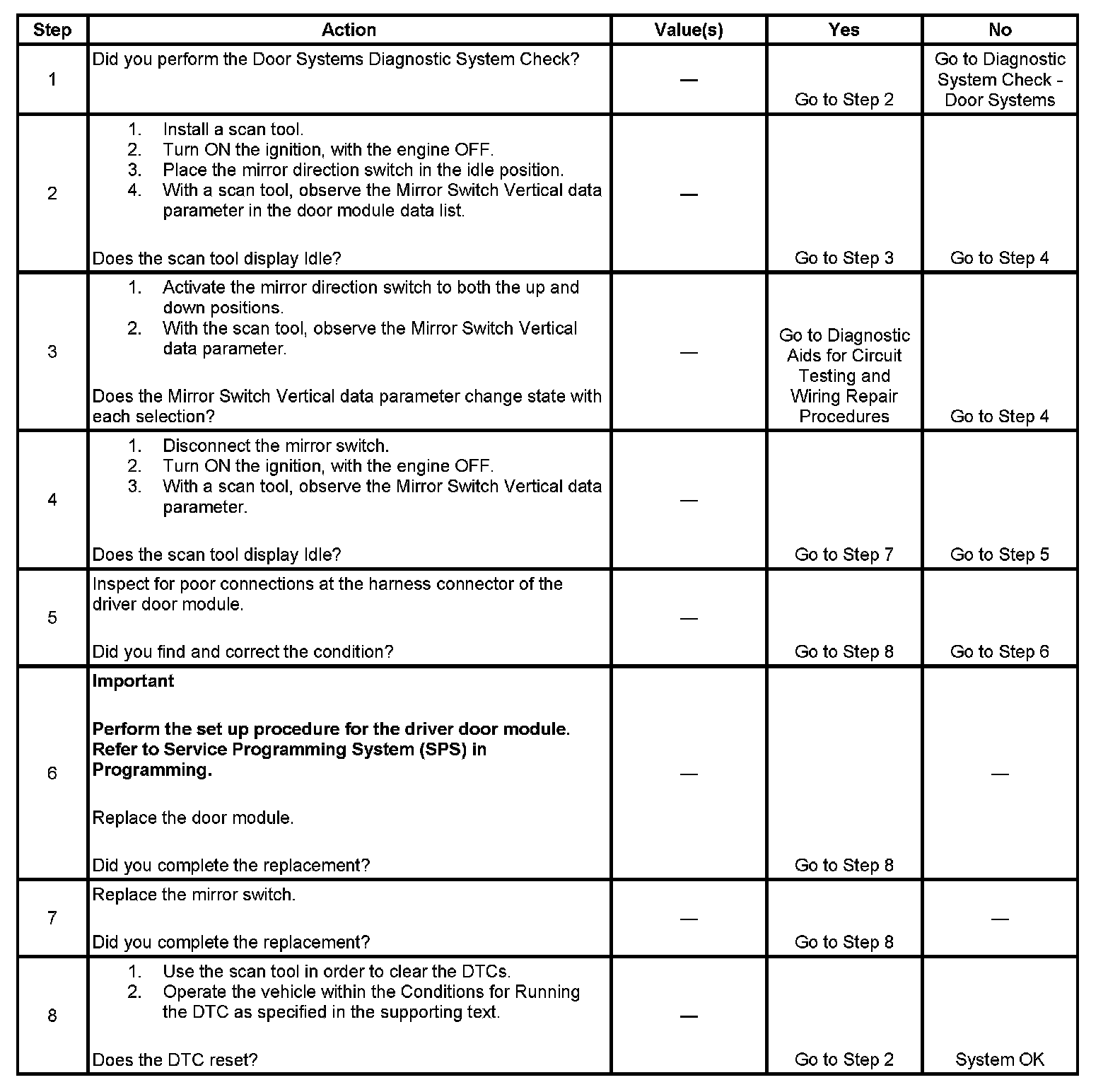 When the fault is no longer present, the door module changes the current DTC to a history DTC. The door module will clear the history DTC after 50 fault free ignition cycles, or in response to a scan tool command.