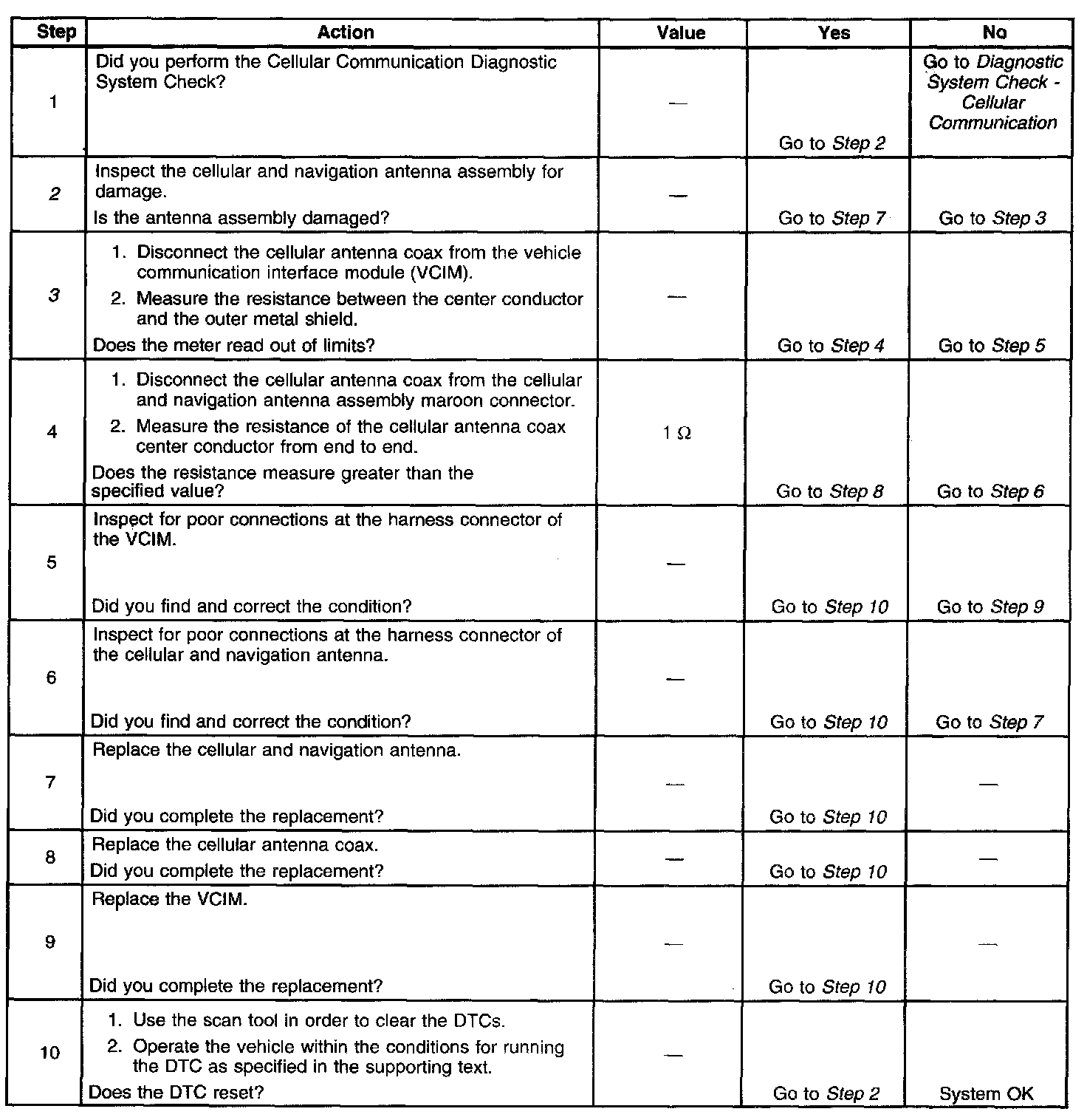 The numbers below refer to the step numbers on the diagnostic table.