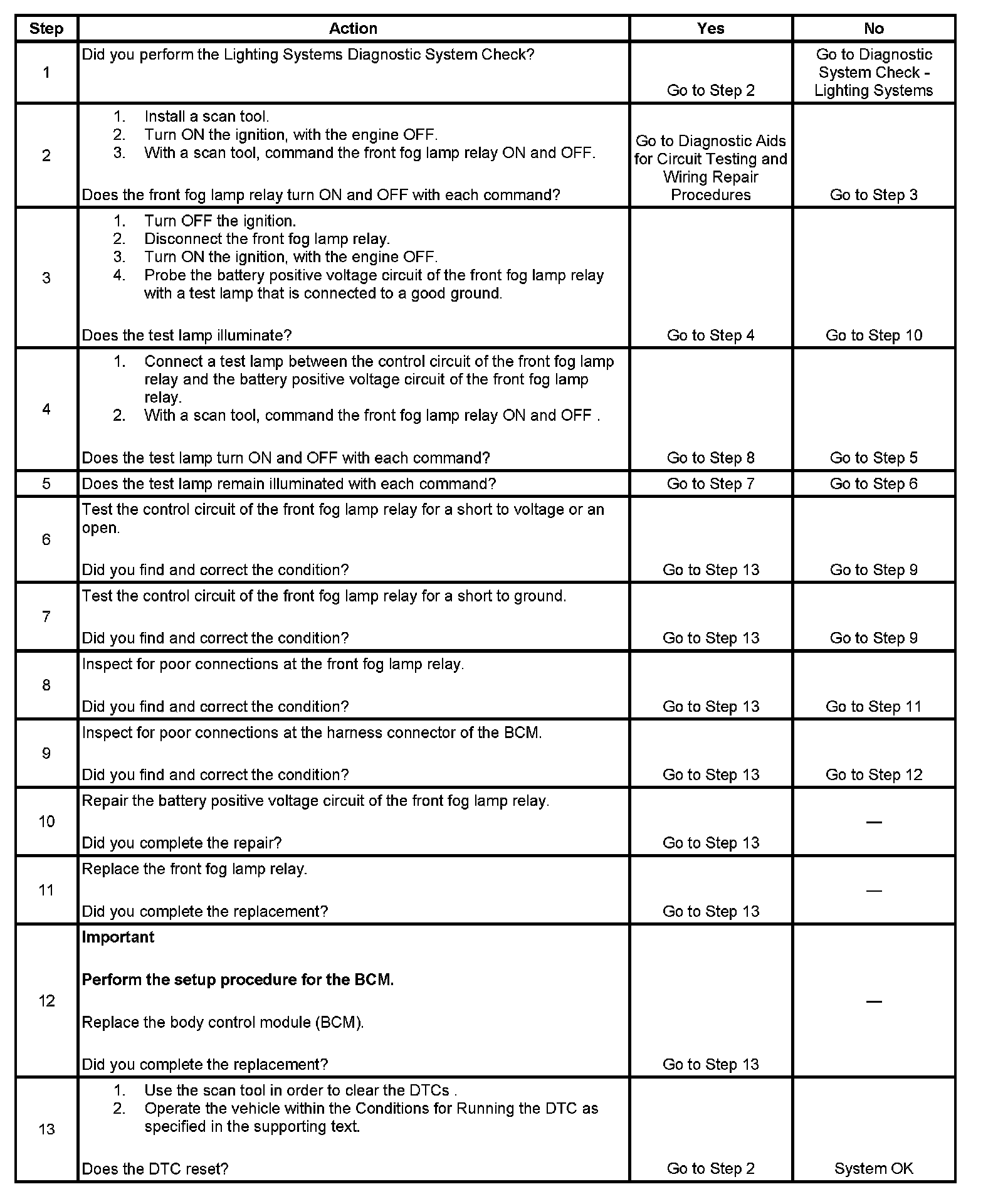 When the BCM senses that the front fog lamp switch signal circuit is grounded momentarily by pressing the front fog lamp switch, the BCM energizes the front fog lamp relay by grounding the front fog lamp relay control circuit. The front fog lamp indicator is also illuminated utilizing the same fog lamp relay control circuit.