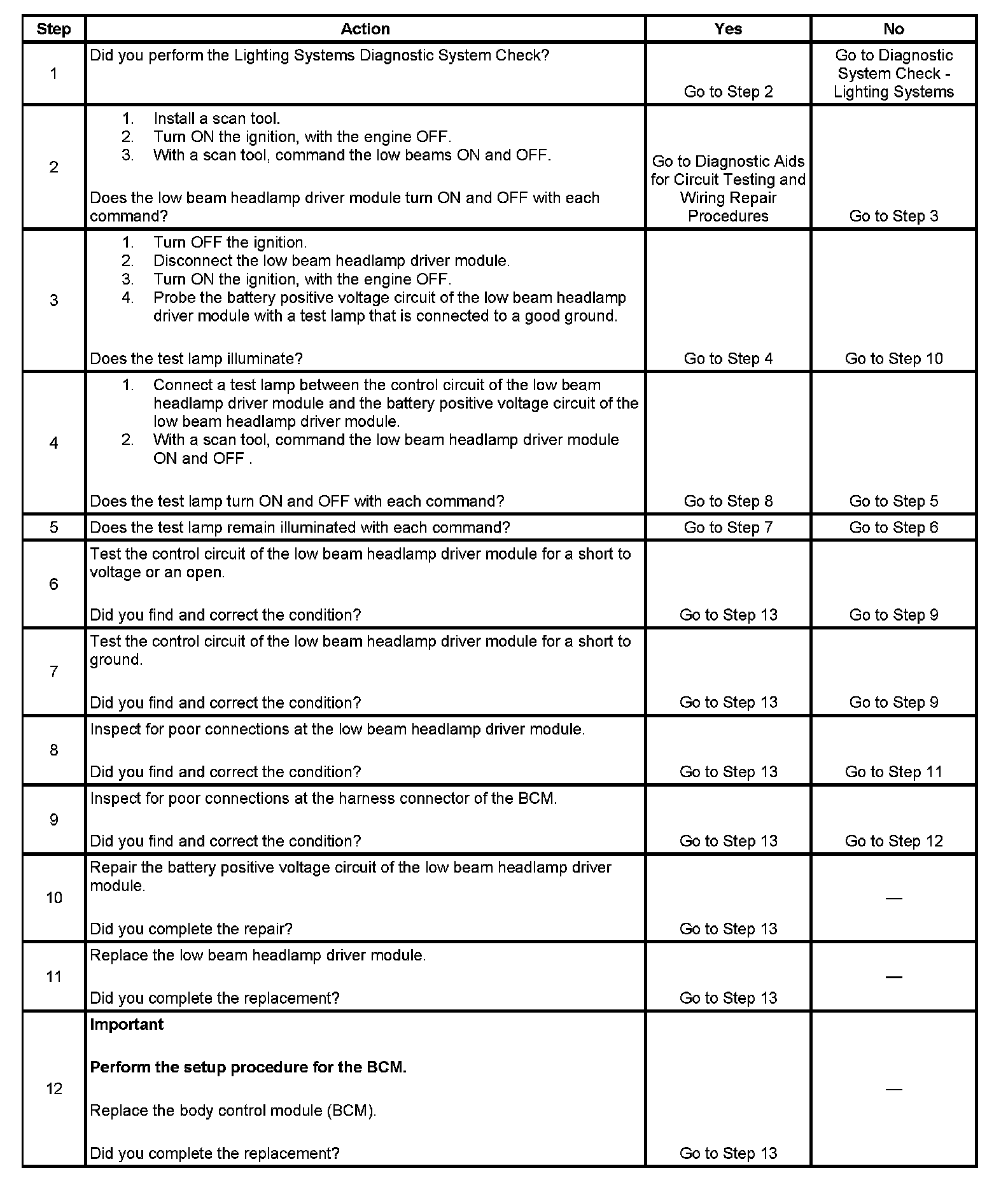 - When the BCM receives a command to illuminate the low beam or DRL headlamps and the low beam headlamp driver module control circuit is open or shorted to voltage.