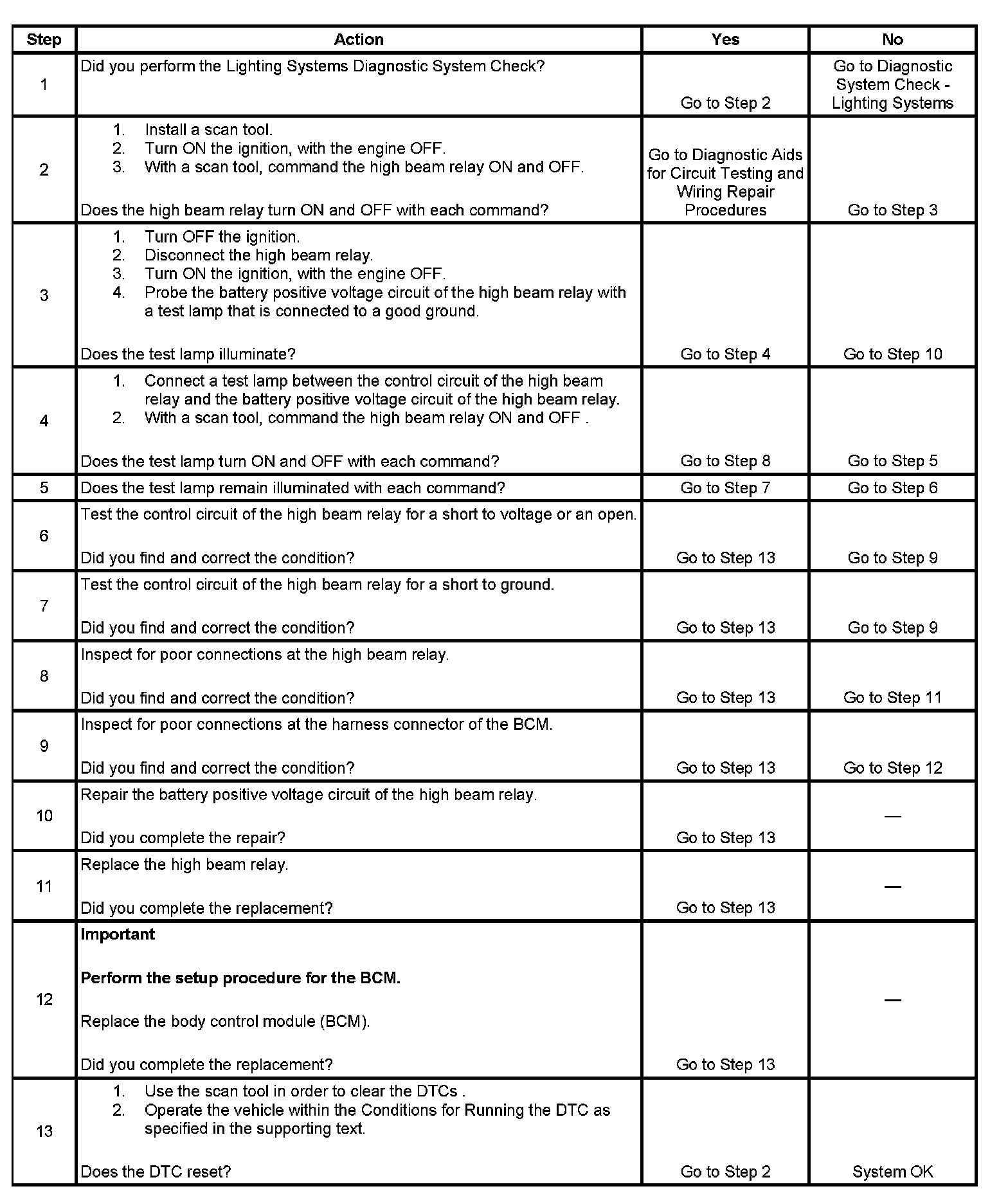 - When the BCM receives a high beam headlamp ON command and the high beam headlamp relay control circuit is shorted to voltage or open.