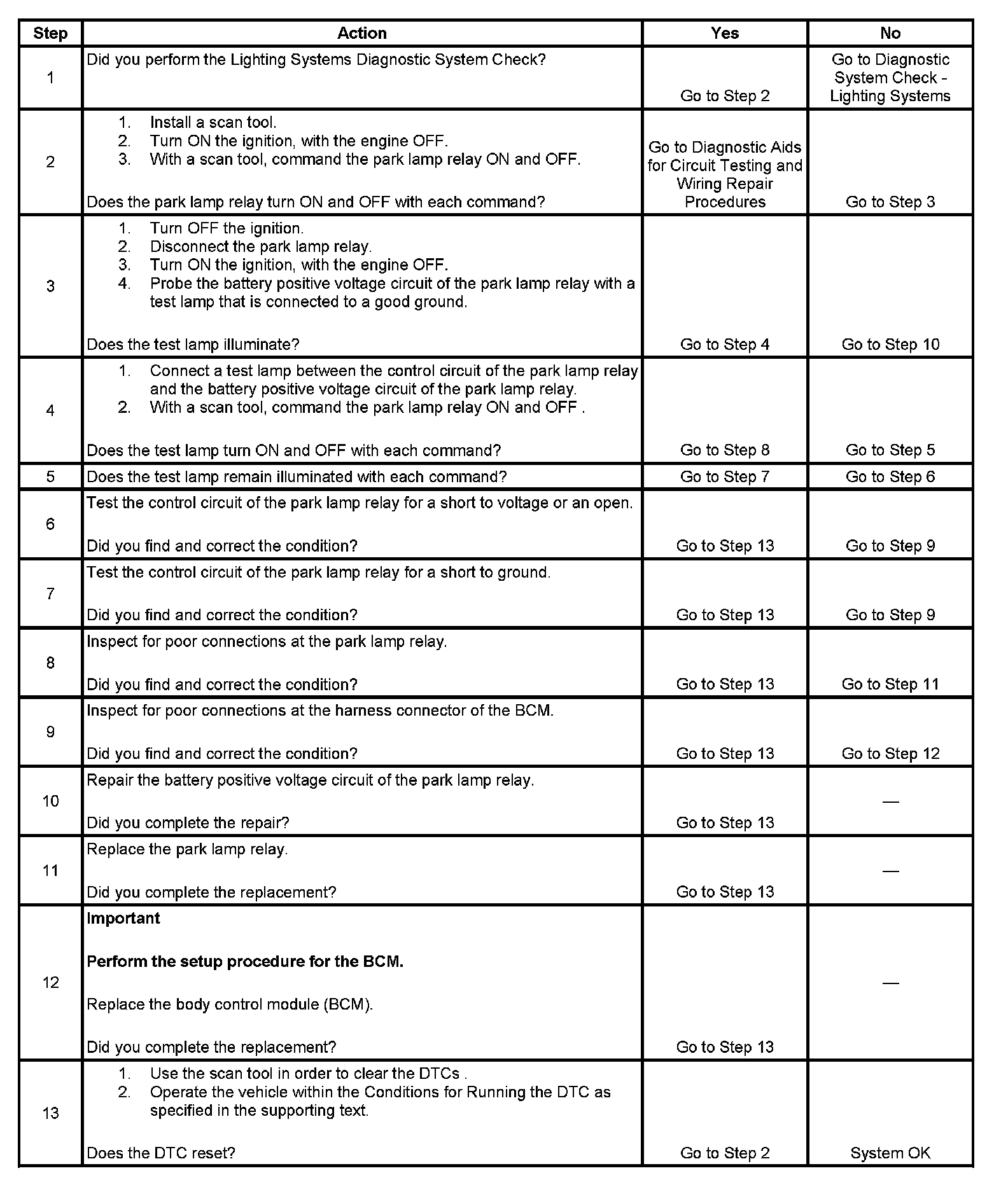 - When the BCM receives a park lamp OFF command and the park lamp lamp relay control circuit is shorted to ground.