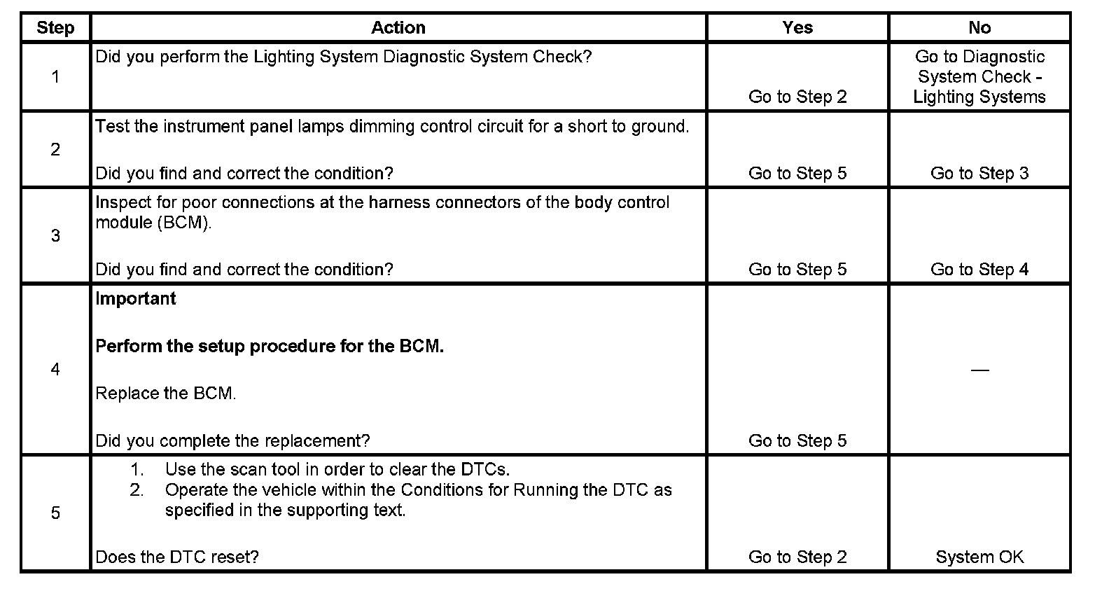 - When the BCM receives a instrument panel lamps illumination request signal and the instrument panel lamps dimming control circuit is shorted to ground.