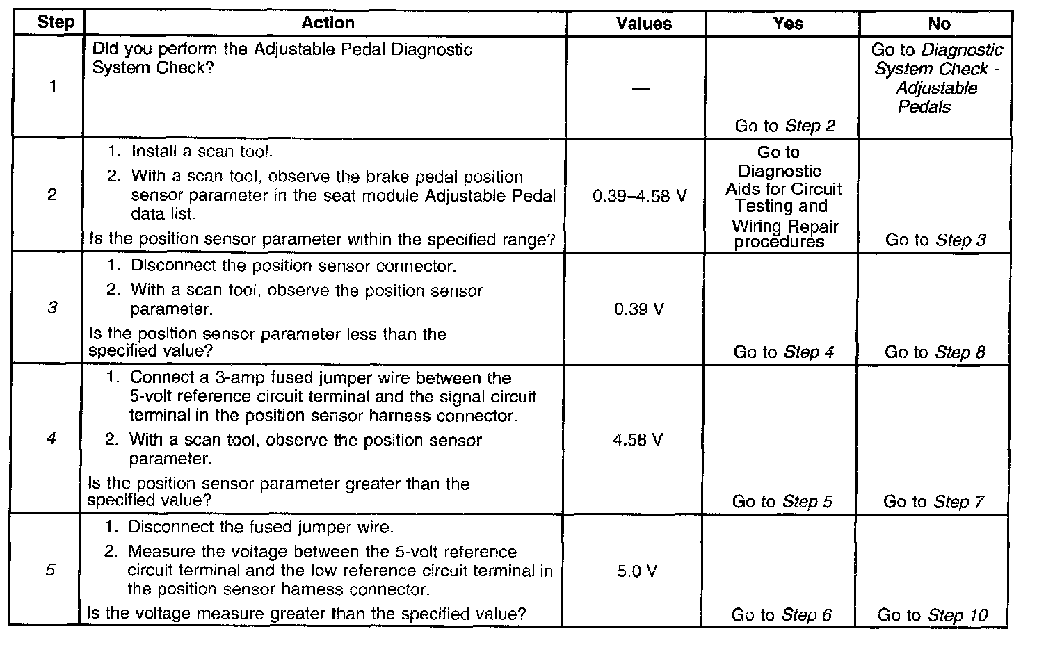 The driver seat module monitors the location of the adjustable pedals using the brake pedal position sensor. The brake pedal position sensor is supplied with 5-volt reference and ground circuits from the driver seat module. The position sensor signal circuit is referenced from ground within the driver seat module. The signal voltage monitored by the driver seat module ranges from 0.39-4.58 volts and is determined by the wiper location on the resistor within the position sensor. The position sensor circuit voltage level is used by the driver seat module to determine the position of the adjustable pedals when storing or recalling memory position settings.