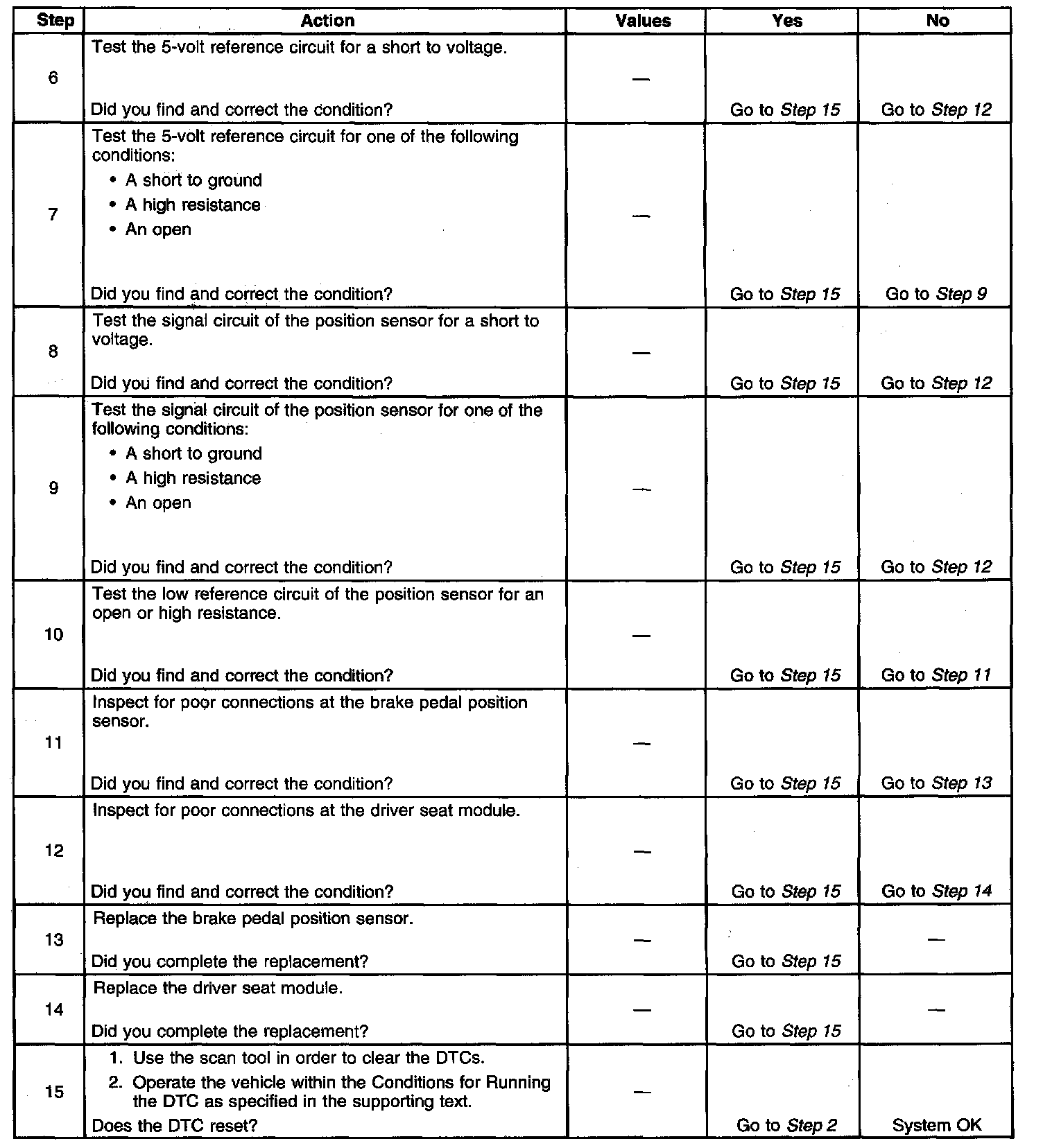The numbers below refer to the step numbers on the diagnostic table.