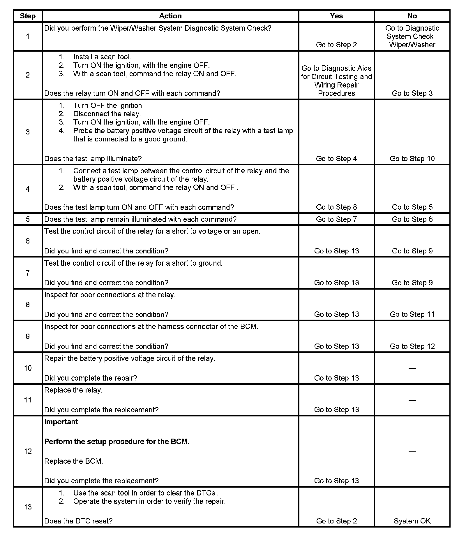 The rear washer relay control circuit is shorted to ground or open while the relay is de-energized, or shorted to B+ while the relay is energized.