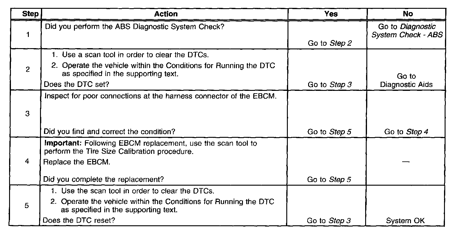 ^ After the DTC is cleared and the ignition is ON, the ABS indicator may remain ON until the EBCM completes a power-up self-test. This test concludes when the vehicle reaches a speed greater than 13 km/h (8 mph) and the wheel speeds are verified by the EBCM.