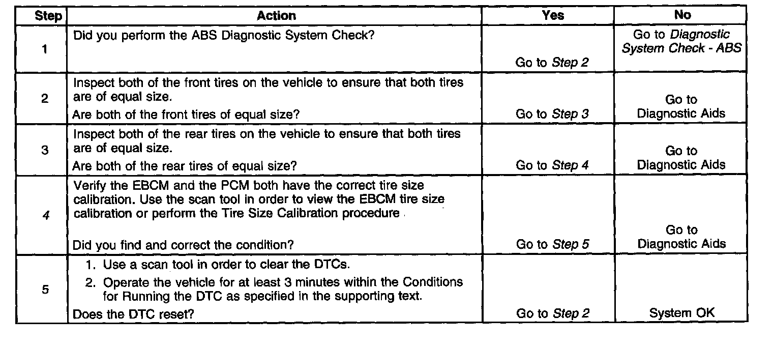 The EBCM detects that one wheel speed input is 10 percent greater than or 10 percent less than the other wheel speed inputs within 3.2 km (2 miles) of driving.