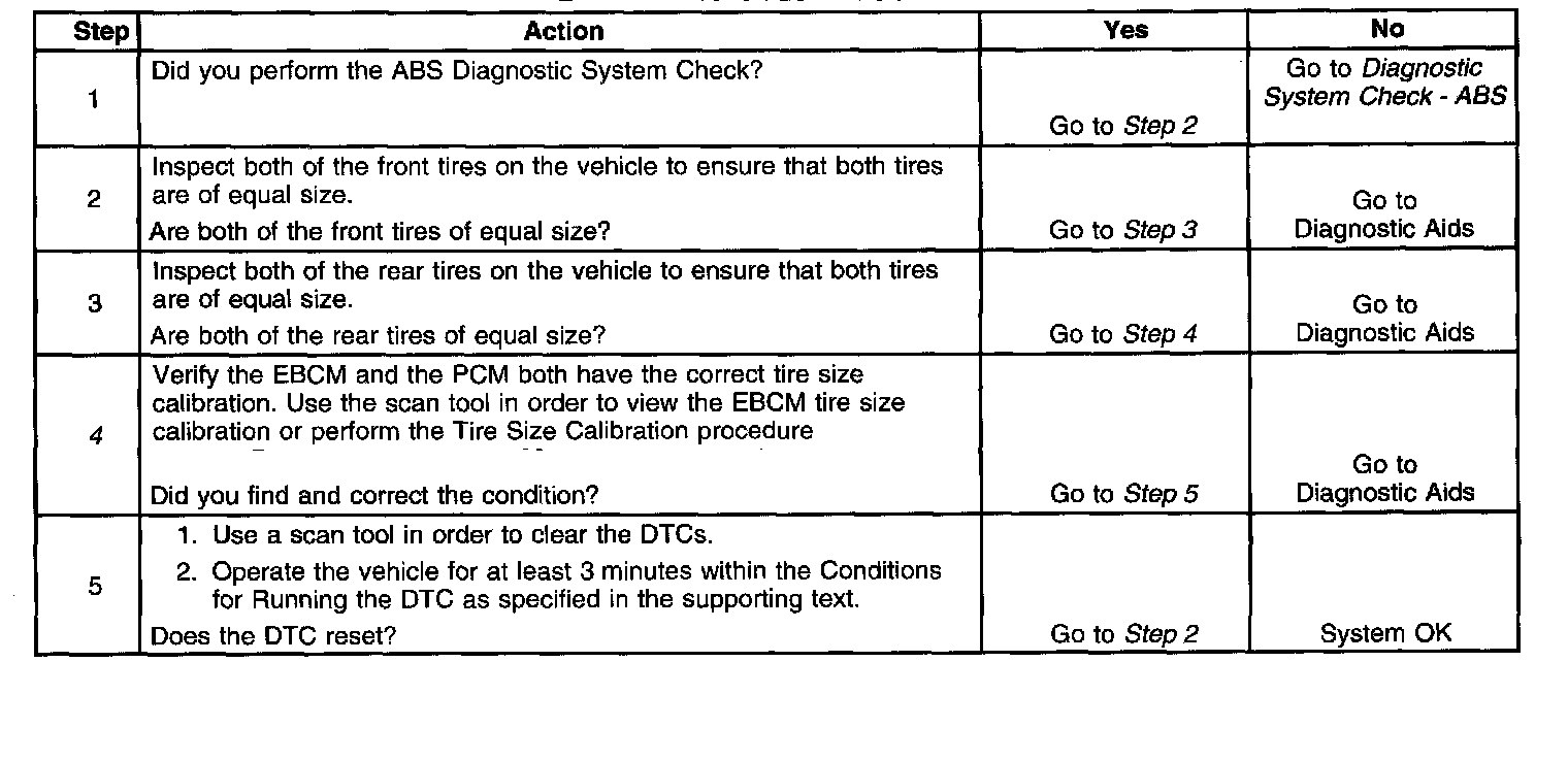 Installing one tire of significantly different size on the vehicle causes this DTC to set. Operating the vehicle with a tire that has very low air pressure may also set this DTC. Inspect the vehicle for an incorrect or damaged wheel speed sensor or vehicle speed sensor if the tires and the EBCM and PCM calibrations are OK.