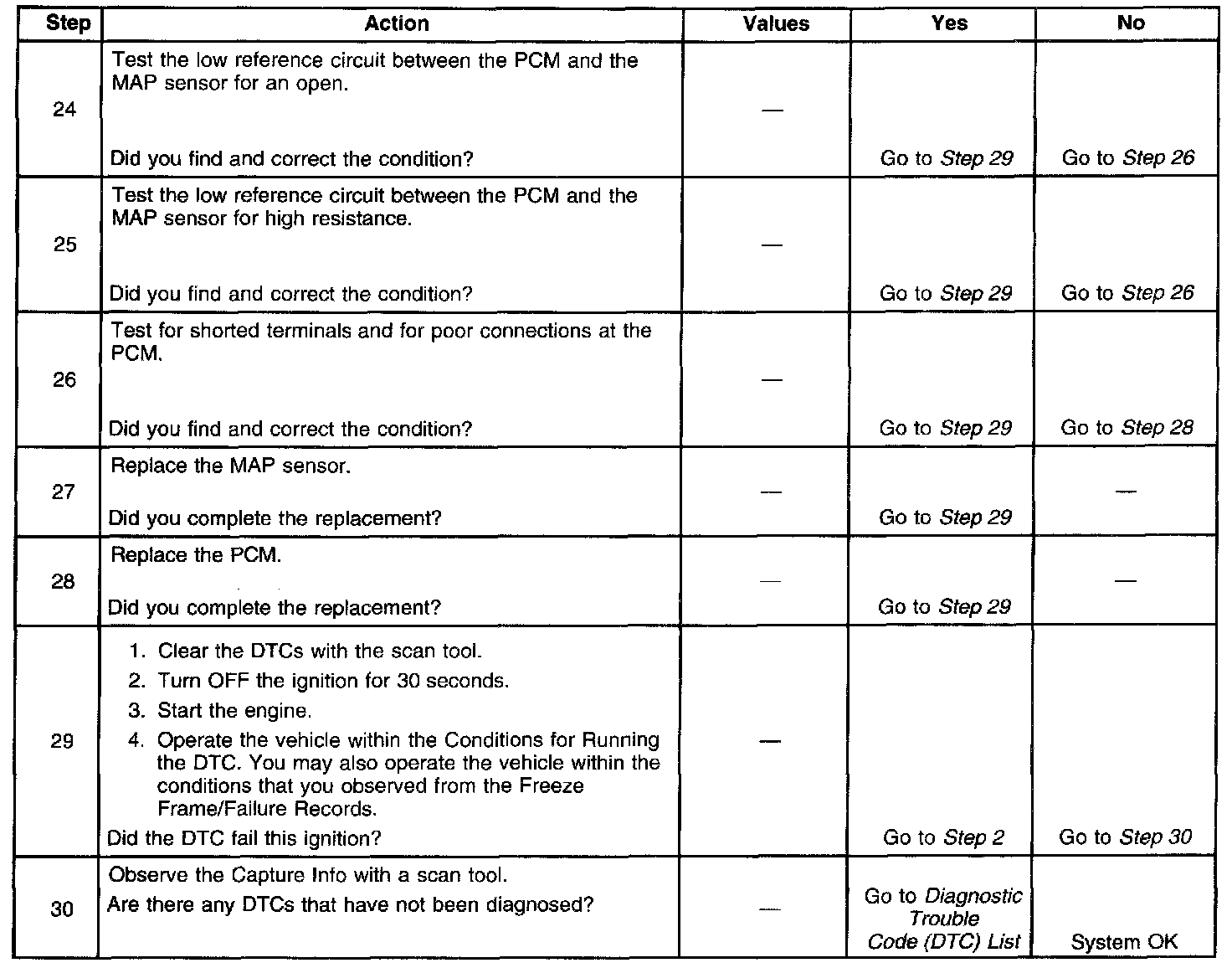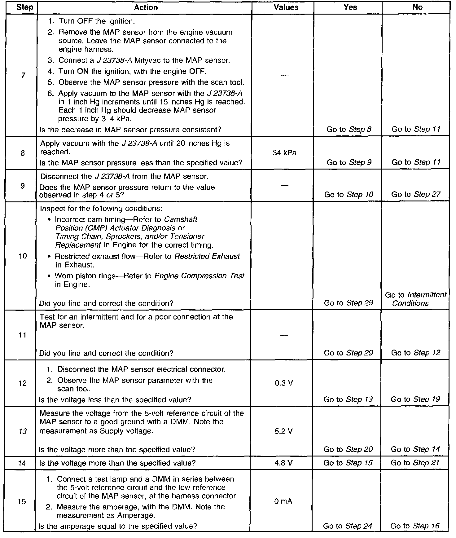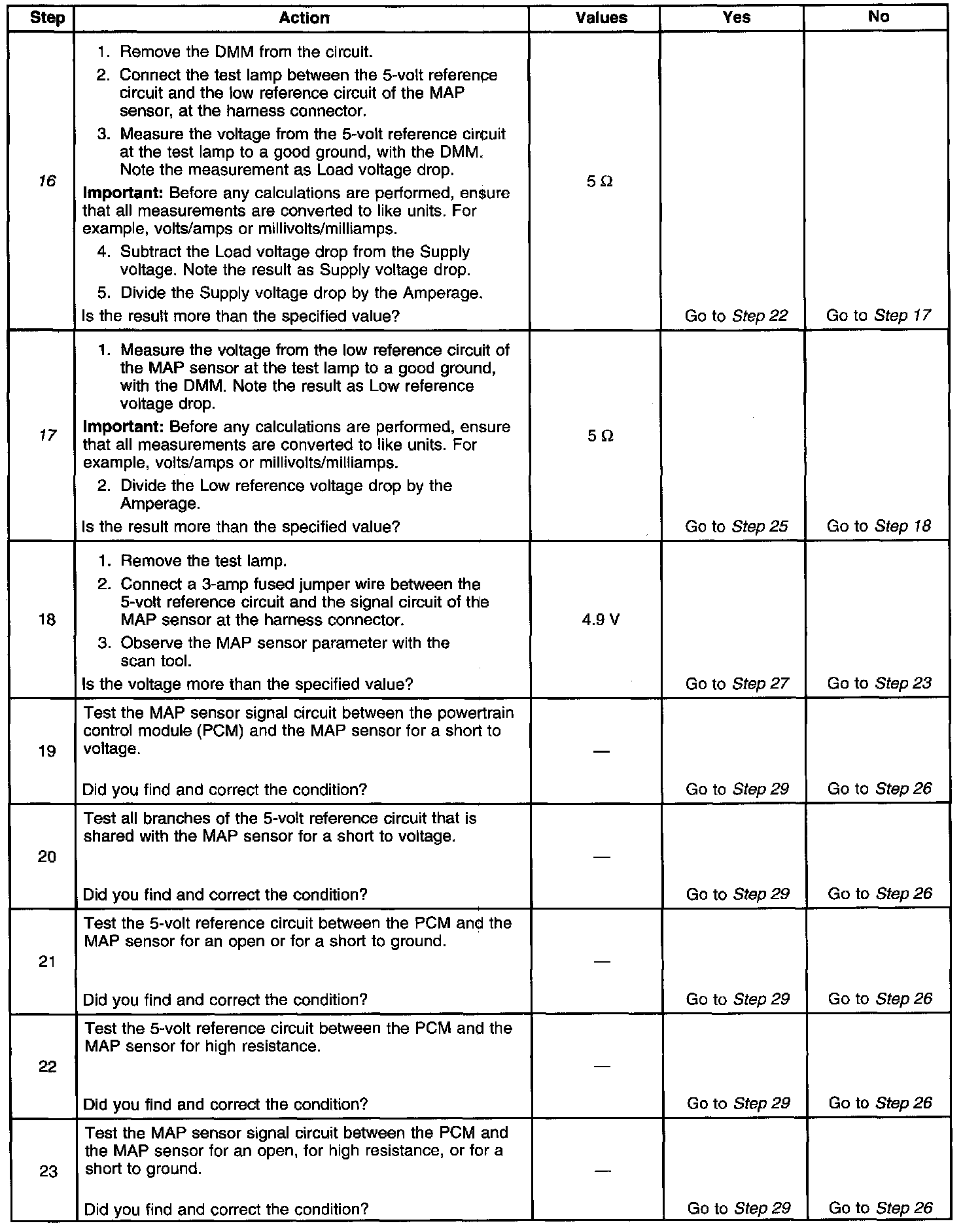 The powertrain control module (PCM) supplies 5 volts to the MAP sensor on the 5-volt reference circuit. The PCM also provides a ground on the low reference circuit. The MAP sensor provides a signal to the PCM on the MAP sensor signal circuit which is relative to the pressure changes in the manifold. The PCM should detect a low signal voltage at a low MAP, such as during an idle or a deceleration. The PCM should detect a high signal voltage at a high MAP, such as the ignition is ON, with the engine OFF, or at a wide-open throttle (WOT). The MAP sensor is also used in order to determine the barometric pressure (BARO). This occurs when the ignition switch is turned ON, with the engine OFF. The BARO reading may also be updated whenever the engine is operated at WOT. The PCM monitors the MAP sensor signal for voltage outside of the normal range.