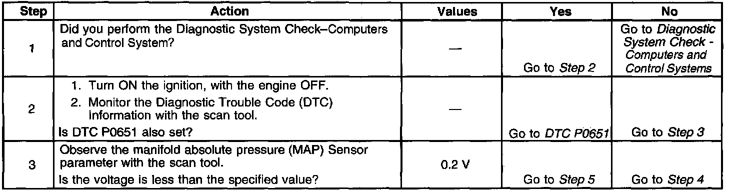 If the PCM detects a MAP sensor signal voltage that is excessively low, DTC P0107 sets.