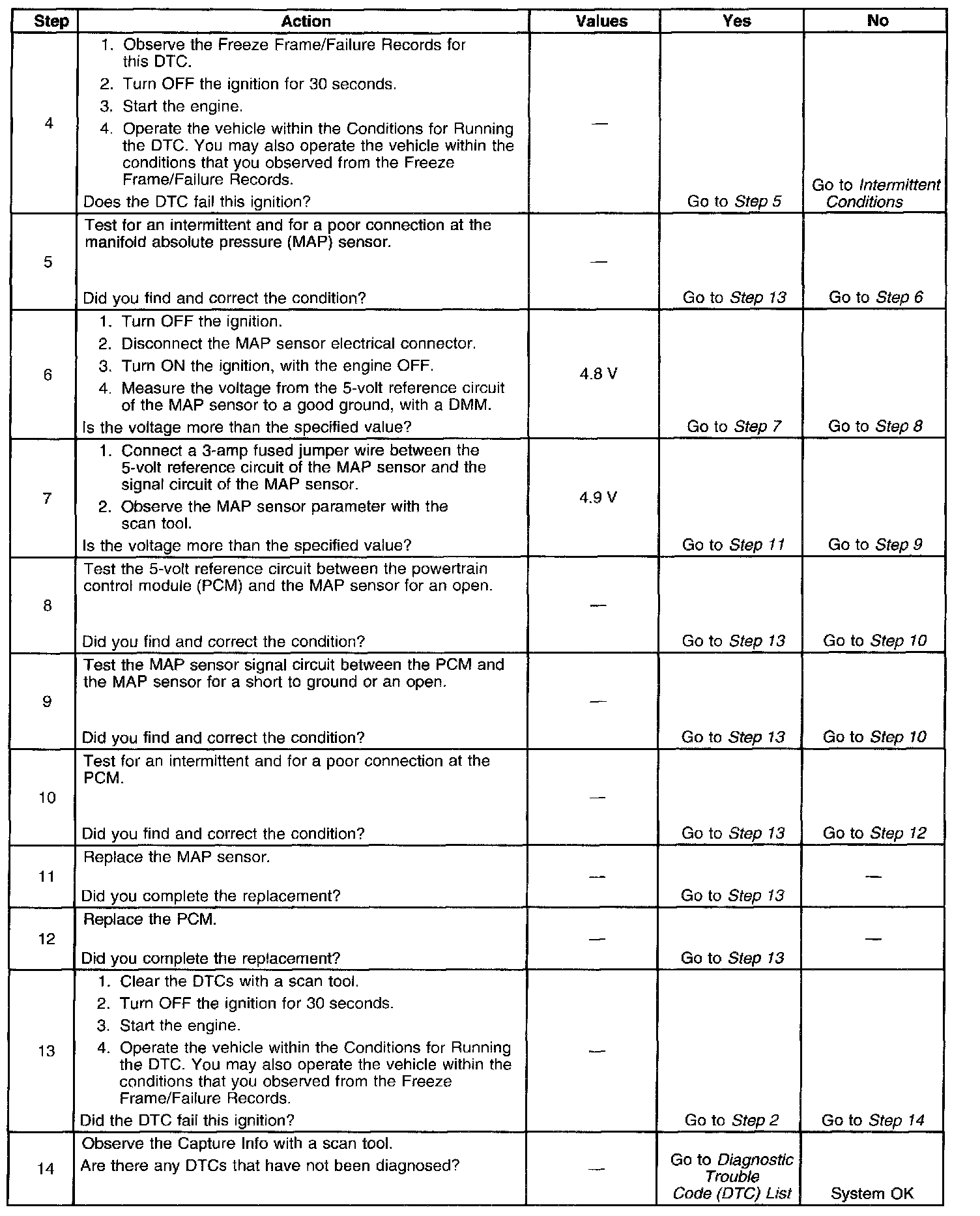The PCM detects that the MAP sensor voltage is less than 0.2 volt for more than 6 seconds.