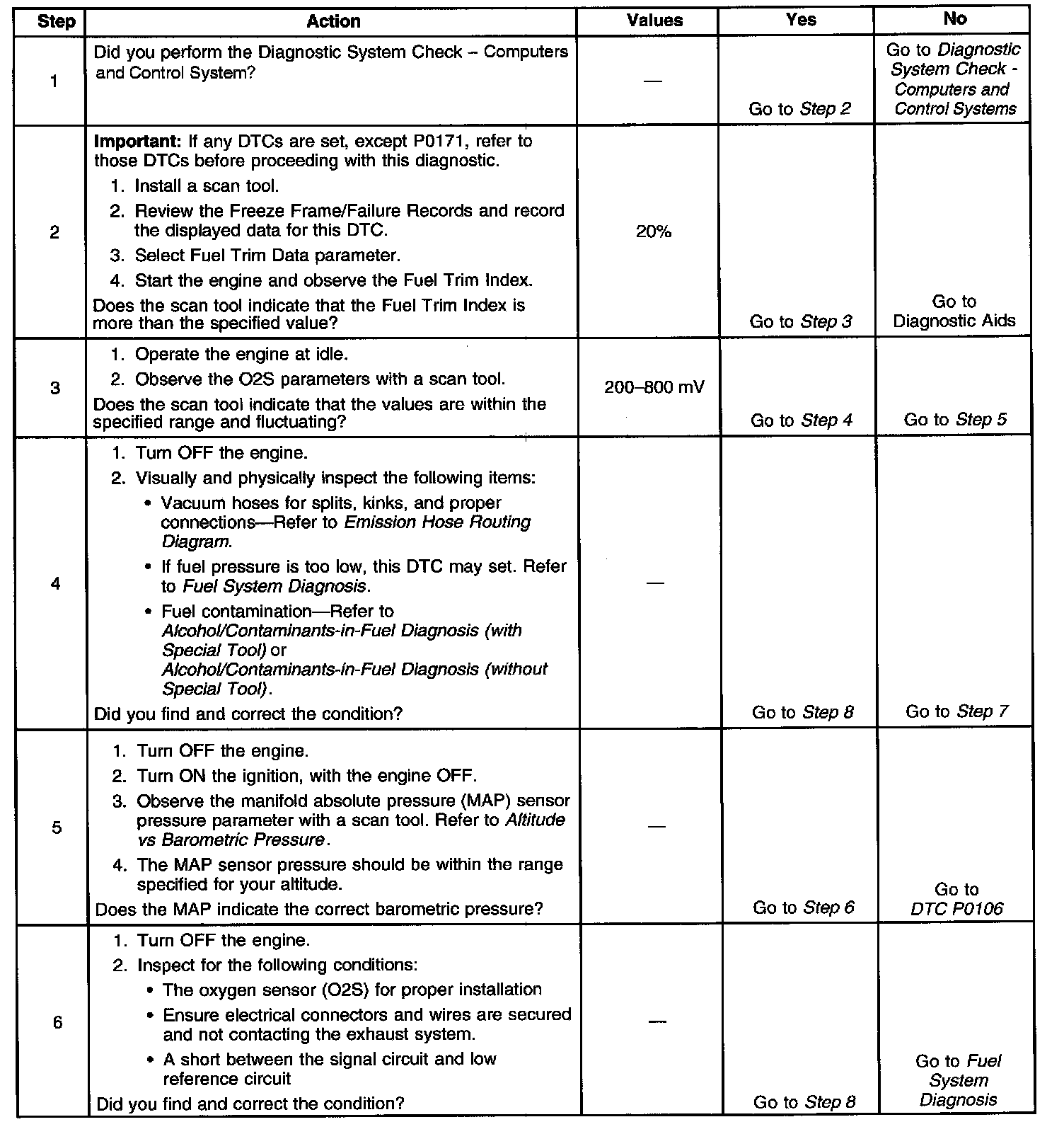The powertrain control module (PCM) controls the air/fuel metering system in order to provide the best possible combination of driveability, fuel economy and emission control. Fuel delivery is controlled differently during open and Closed Loop. During Open Loop, the PCM determines fuel delivery based on sensor signals, without oxygen sensor (O2S) input. During Closed Loop the PCM adds O2S inputs to calculate Short and Long Term Fuel Trim (FT) fuel delivery adjustments. Short Term FT values change rapidly in response to the heated oxygen sensor (HO2S) voltage signals. Long Term FT values change slower in response to trends in Short Term FT adjustments. Fuel Trim Index is the average of Short Term and Long Term FT and Purge Learn Memory based on engine speed and load. If the PCM detects an excessively lean condition, DTC P0171 sets.