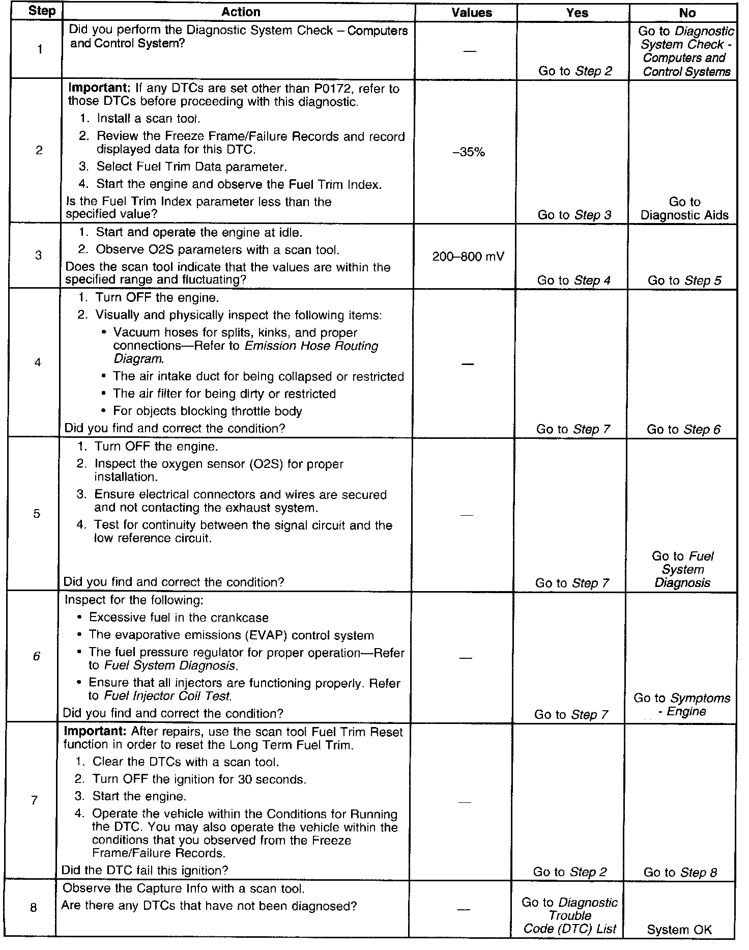 The powertrain control module (PCM) controls the air/fuel metering system in order to provide the best possible combination of driveability, fuel economy and emission control. Fuel delivery is controlled during Open and Closed loop. During Open Loop the PCM determines fuel delivery based on sensor signals, without oxygen sensor (O2S) input. During Closed Loop, the O2S inputs are added and used by the PCM to calculate Short and Long Term Fuel Trim (FT), fuel delivery adjustments. Short Term FT values change rapidly in response to the heated oxygen sensor (HO2S) voltage signals. Long Term FT values change slower in response to trends in Short Term FT adjustments. The Fuel Trim Index is the average of Short and Long Term FT and Purge Learn Memory based on engine speed and load. Fuel trim diagnostic will conduct a test to determine if a rich failure actually exists or if excessive vapor from the evaporative emission (EVAP) canister is causing a rich condition. If the PCM detects an excessively rich condition, DTC P0172 sets.